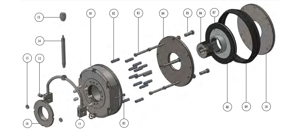 可使用特殊阻尼元件降低制動(dòng)器的工作噪音,這些阻尼元件安裝在柱面和電樞板之間,起到減震器的作用。